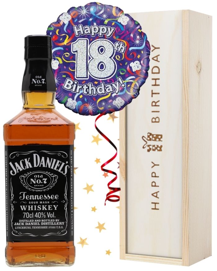 What better way to celebrate someone turning 18 than sending them their first legal bottle of Whiskey? Help make their 18th birthday special by gifting someone a single bottle of the famous Jack Daniels Old No. 7 Tennessee Whisky. It’s presented in one of our wooden ‘Happy Birthday’ gift boxes and is paired with a fully-inflated 18th birthday balloon to create the perfect birthday gift! It’s also protected with wood wool to ensure safe next day or selected date delivery anywhere in the UK. Plus, don’t forget to personalise this gift with a printed gift message and make them feel extra special on their birthday.