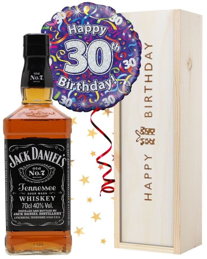 Bring the taste of Tennessee into someone’s 30th birthday celebrations by sending them this exceptional Whiskey gift. Perfect for anyone who loves Whiskey, let someone turning 30 enjoy a single bottle of Jack Daniels Old No. 7 Tennessee Whiskey and make their day extra special. It’s presented in one of our wooden gift boxes and also comes with a fully inflated 30th birthday balloon to create the ultimate birthday experience. Easy to personalise, this gift also comes with a message printed onto a gift card to let your lucky recipient know who it’s from. Have it delivered anywhere in the UK with next day or selected date delivery.