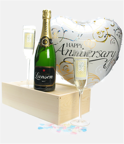 30 years together cannot go un-celebrated and deserves an extra special gift. This is the perfect gift for any couple celebrating the milestone. Let them celebrate in style with a single bottle of Lanson Black Label Champagne with a pair of 30th Wedding Anniversary flutes to keep for memories of the occasion. Packed with a fun, helium Happy Anniversary Balloon, this gift is guaranteed to make the occasion feel both memorable and distinct. Finish the gift with a personalised message and have it delivered the next day or on a date of your choice.