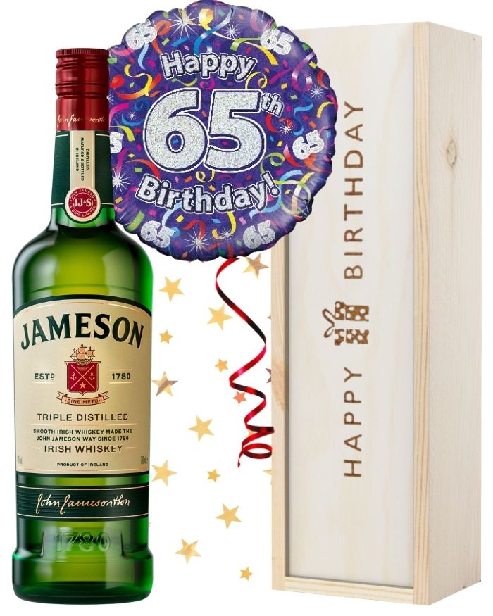 No matter where they’re celebrating, send someone this delicious Irish Whiskey and balloon gift to brighten their birthday. Help someone celebrate their 65th birthday with a single bottle of Jameson Irish Whiskey to share and enjoy. It’s stylishly presented in one of our wooden gift boxes with ‘Happy Birthday’ printed on the lid and wood wool lining for protection. It also includes a fully-inflated helium balloon and a personalised message printed onto a beautiful gift card. Send this gift set anywhere in the UK with next day or selected date delivery to make their 65th the best birthday yet. It’s the perfect gift for anyone who loves Whiskey!
