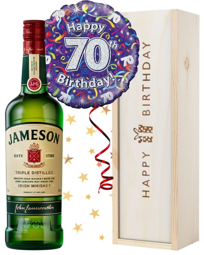 If you’re looking for something classic and unique for a Whiskey drinker’s 70th, this is it. Treat someone to a single bottle of perfected Jameson Irish Whisky to sip down whilst celebrating their milestone. Plus, nothing says special birthday more than a fully-inflated 70th Birthday balloon to surprise the recipient upon opening. Presented in one of our ‘Happy Birthday’ wooden gift boxes, this is sure to make them smile. Complete the gift with a personalised message to let them know you’re celebrating with them and sign it from the whole family. Get it delivered on a day of your choice or even the next day.