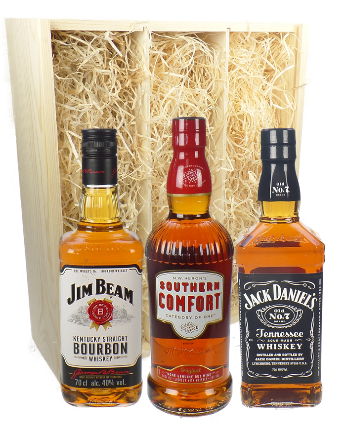 Fans of Bourbon style American Whiskey will enjoy this gift. Probably the three biggest brands of Bourbon are included here in this gift set. A bottle of Jack Daniels Number 7, a bottle of Jim Beam and a bottle of Southern Comfort, all come presented in the one wooden gift box.