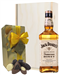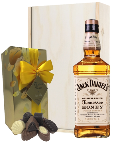 An extraordinary gift set that offers remarkably sweet and amazingly delicious flavours from beginning to end; this Jack Daniels Honey and Chocolates Gift Set features truly unmatchable taste and absolute class that no other gift option can match. Presented in a solid wooden gift box and simple to customize with a personal message from you if desired, this gift set includes a single bottle of Jack Daniels Honey Whiskey and a 125g box of assorted Belgian chocolates within it to enjoy. The perfect present for anyone on your gift list, this chic and sturdy gift box will fully satisfy any whiskey-lover from your grandpa to your best mate.