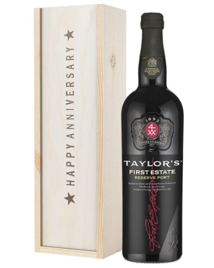 Surprise that special someone with an extraordinarily tasty bottle of port like they’ve never tasted before; the truly delicious bottle of Taylors First Estate Reserve Port included within this exclusively designed gift box boasts a bold and remarkable flavour that you simply won’t get anywhere else. A fun and fashionable anniversary gift that comes presented in a solid wooden gift box lined with wood wool all throughout the interior, this Port Anniversary Gift Box can also be customised with a personal message from you along with it if needed. Celebrate your wedding anniversary or the anniversary of any other event in your life; no other gift set features the level of style and true sophistication that this one does.