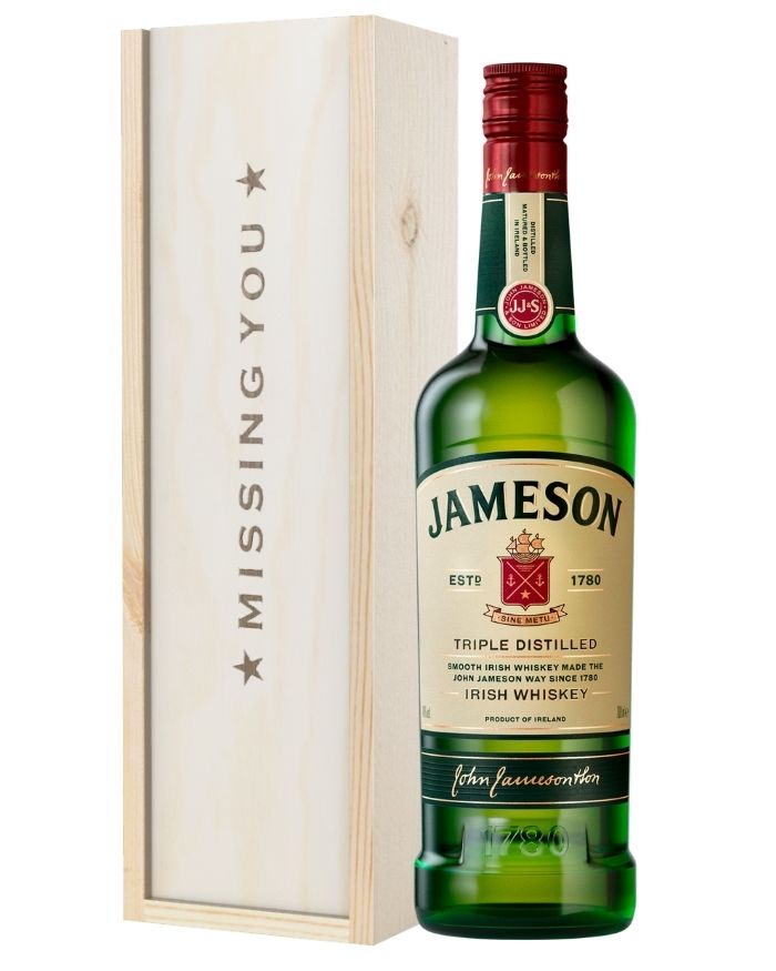 Offering an incredibly tasty bottle of Irish Whiskey and designed to make any recipient feel truly special the moment it arrives; this amazingly chic gift set can be personalised with a heartfelt message from you to be included along with it if desired. Presented in a high-quality wooden gift box that is lined with wood wool and stamped with the words Missing You on top. This Irish Whiskey Missing You Gift Box will instantly transform the day of anyone fortunate enough to receive it. Complete with a single bottle of Jameson Triple Distilled Irish Whiskey, no other gift set on the market offers the level of class, sophistication, and flavour that this one does.