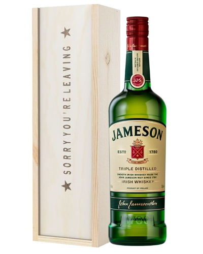 A tasty way to wish anyone luck on their future endeavours; this Irish Whiskey Sorry You Are Leaving Gift Box is designed to fill any recipient with true appreciation throughout every single sip it provides. Easy to personalise with a message from you as well if desired, this gift box comes with a single bottle of Jameson Triple Distilled Irish Whiskey and features the words, Sorry You’re Leaving printed perfectly on top. Delivered in a solid wooden gift box that is internally lined with wood wool to ensure secure delivery, this gift set offers classic, delicious flavours you simply cannot get anywhere else.