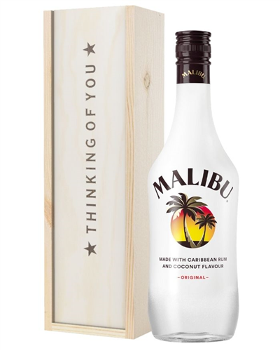 An amazingly thoughtful gift option that features everything you need to show someone in your life just how much you care. Simple to personalise with a message from you as well, this Malibu Thinking of You Gift Box allows you to send your warmest thoughts, no matter how distant or close by you may be. Presented in a durable wooden gift box that is lined with wood wool for secure delivery to any location, feel confident sending this gift set any day of the year and know you’ve sent the absolute best for them to enjoy. Complete with a single bottle of Malibu Caribbean Coconut Rum to enjoy, this gift box is certain to be the most flavourful gift they’ve ever received.