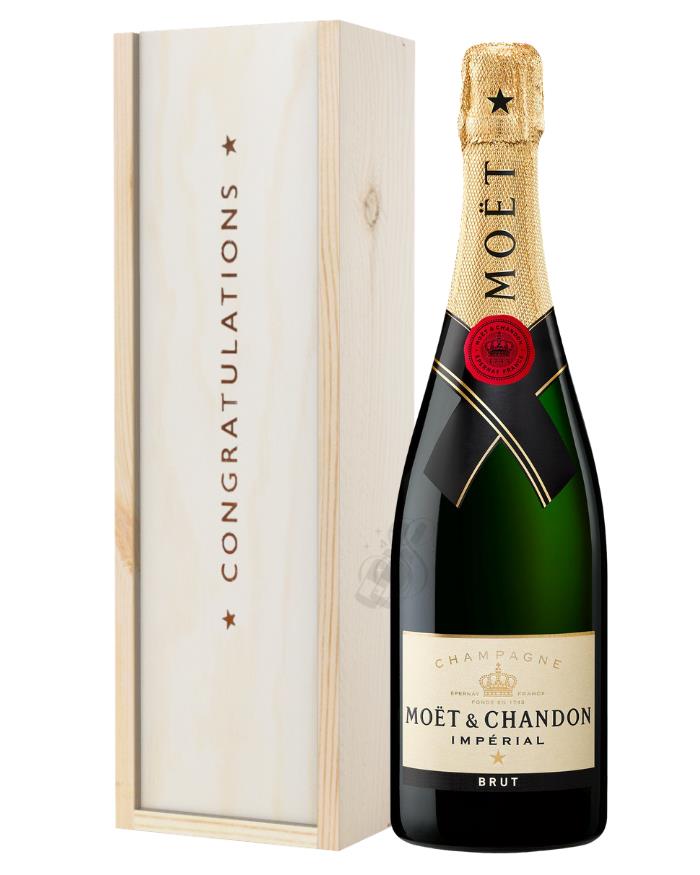 Send your heartfelt congratulations, and do it in absolute style, when you have one of these incredibly sophisticated Moet et Chandon Champagne Congratulations Gift Boxes delivered to someone you care for. A truly delectable blend of chardonnay, pinot noir and pinot meunier that creates a one of a kind flavour anyone can fully appreciate; when you choose to send this wonderful gift box it’s obvious upon arrival what it’s meant for and what the recipient is meant to celebrate. Presented in a strong, trendy wooden box with the world ‘Congratulations’ written boldly upon the top of it, this stunning gift set is easy to personalise and allows you to celebrate an accomplishment with someone no matter the distance between you.