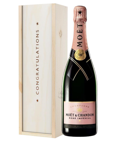 Send a beautiful and delicious congratulations with this magnificent Champagne gift. Whether they got a promotion, exam results or are celebrating a life milestone, let them pop open a single bottle of the delightful Moet & Chandon Rose Imperial Champagne. It’s presented in one of our classic wooden gift boxes with ‘Congratulations’ printed on the lid and wood wool lining for style and protection. Extend your congratulations with a personalised message and make this the perfect gift. Have it delivered anywhere in the UK with next day or selected date delivery. So no matter where they are, you can help them celebrate in style!