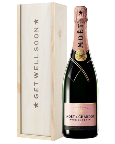 A chic and elegant way to send your warmest thoughts and get well soon wishes to anyone you choose. This Pink Champagne Get Well Soon Gift Box is designed to fill any recipient with absolute warmth and true appreciation from the inside out. Simple to personalise with a message from you as well if desired, this truly high-quality gift set includes a single bottle of Moet & Chandon Rose Imperial Champagne and offers an unmatchable flavour that no other gift box on the market can match. Delivered in a sturdy wooden gift box that comes lined with wood wool to ensure secure delivery, this unique and magnificent gift set also features the words ‘Get Well Soon’ on top as well.