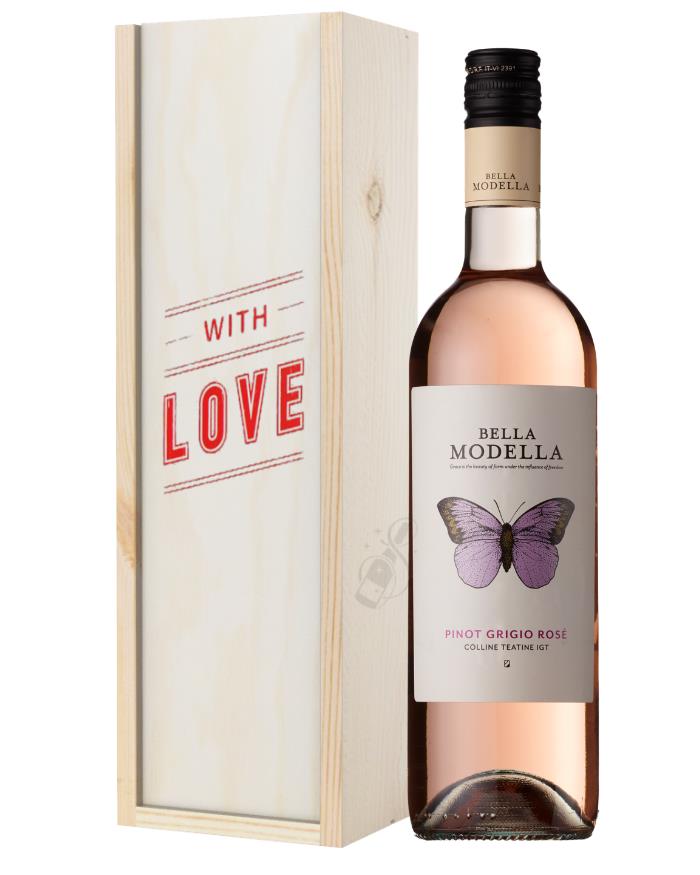 Make this Valentine’s Day bright and fruity with this delicious rose wine gift. Perfect for wine lovers, surprise your Valentine with a single bottle of Bella Modella Pinot Grigio rose wine from Italy. It’s beautifully presented in one of our wooden gift boxes with ‘With Love’ printed on the lid and wood wool lining for style and protection. Plus, add your own personal touch with a written message printed onto a gift card. Delivery is available anywhere in the UK with next day or selected date delivery. It’s the perfect gift to let your Valentine know how you feel and make them feel extra special!