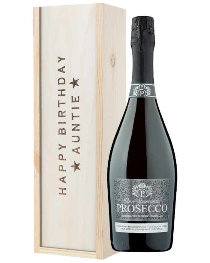 Perfect for any Auntie in your life, treat her to this perfect birthday gift. Ideal no matter where or how she’s celebrating, let her pop open a single bottle of Prosecco on her special day. This gift is presented in one of our traditional wooden gift boxes with ‘Happy Birthday Auntie’ printed on the lid. The box is lined with wood wool for safe delivery and stylish presentation. It’s the perfect gift to make her feel like the best Aunt in the world! You can complete this gift with a personalised message and have it delivered the next day or on a selected date. So no matter what, you can treat your Auntie to a glass of delicious Prosecco on her birthday