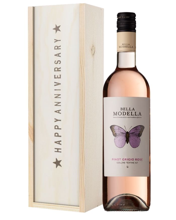 An exclusively designed way to send your warmest anniversary wishes to anyone celebrating a truly special day. It doesn’t matter whether you choose to surprise your spouse, your parents, or even a friend; anyone recipient is certain to appreciate both the sentiment and the flavours, this gift set provides. Complete with a single bottle of Pinot Grigio Rose Wine and delivered securely within a sturdy wooden gift box with the words ‘Happy Anniversary’ printed clearly on top, this gift box is made for secure delivery to any location needed. Easy to personalise with a message from you as well, this Rose Wine Anniversary Gift Box will bring warmth and satisfaction to anyone fortunate enough to receive it.