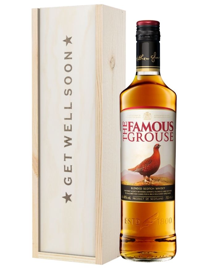 Say ‘Get Well Soon’ and do it with unmatchable style; when you choose to send one of these one-of-a-kind Scotch Whisky Get Well Soon Gift Boxes to someone in your life, you can be sure you’ve sent the absolute best for them to enjoy as soon as they feel better. Presented in a durable wooden gift box and lined with wood wool for secure delivery to any location, this gift set also features a truly protective wood wool lining within as well as the words ‘Get Well Soon’ stamped clearly on top. Easy to personalise with a message from if desired, this gift box includes a single bottle of The Famous Grouse Blended Scotch Whisky within it to enjoy.