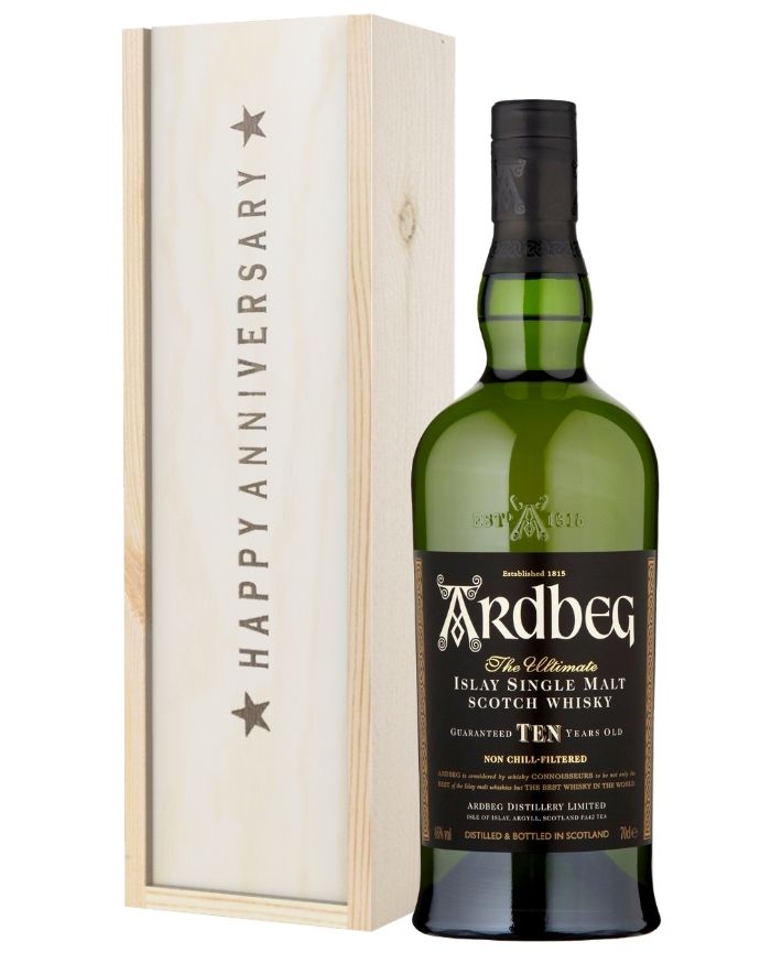 Especially significant for anyone celebrating a 10th anniversary of any kind; complete with a single bottle of Ardbeg 10-Year-Old Islay Single Malt Whisky, this high-quality gift box will instantly satisfy any whisky lover it’s sent to from start to finish. Presented in a durable wood-wool lined wooden gift box and beautifully branded with the words ‘Happy Anniversary’ clearly on top, this Islay Whisky Anniversary Gift Box is made to easily withstand delivery to any location required. Easily commemorate any anniversary that comes up; from years of marriage to years of service in your current career or any other anniversary you choose to celebrate this year.