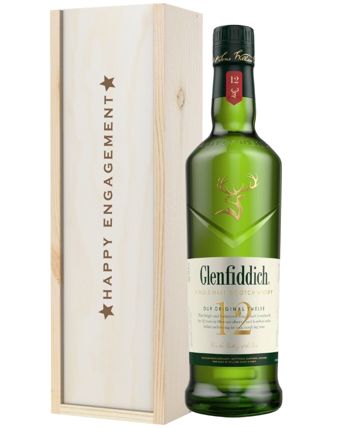 Exceptionally tasteful and beautifully presented, give a newly engaged couple the perfect gift with this Whisky set. Give the happy couple a gift to cherish the milestone with a single bottle of the award-winning Glenfiddich 12 Year Scotch Whisky. Perfect for keeping for memories or sharing with family and friends, have this gift delivered straight to their door for the ultimate surprise. It’s presented in one of our wooden gift boxes with ‘Happy Engagement’ printed on the lid for full effect. Let them know how happy and excited you are for them with a personal message and have it delivered either the next day or on a selected date of your choice.