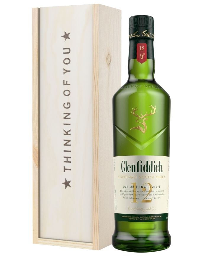 Perfectly housed within a truly high-quality wooden gift box, the single bottle of Glenfiddich 12-Year-Old Single Malt Scotch Whisky inside offers an amazing flavour profile that any whisky drinker will be more than happy to sit back, sip, and enjoy. A great way to send your warmest thoughts to anyone from any member of your family to your best mate; this remarkably chic Whisky Thinking of You Gift Box boasts unmatchable taste and classic sophistication that you simply won’t get from any other gift you could choose to send. Easy to personalise with a message from you if needed, from front to back this gift set is made to fill any recipient with warmth, both figuratively and literally.